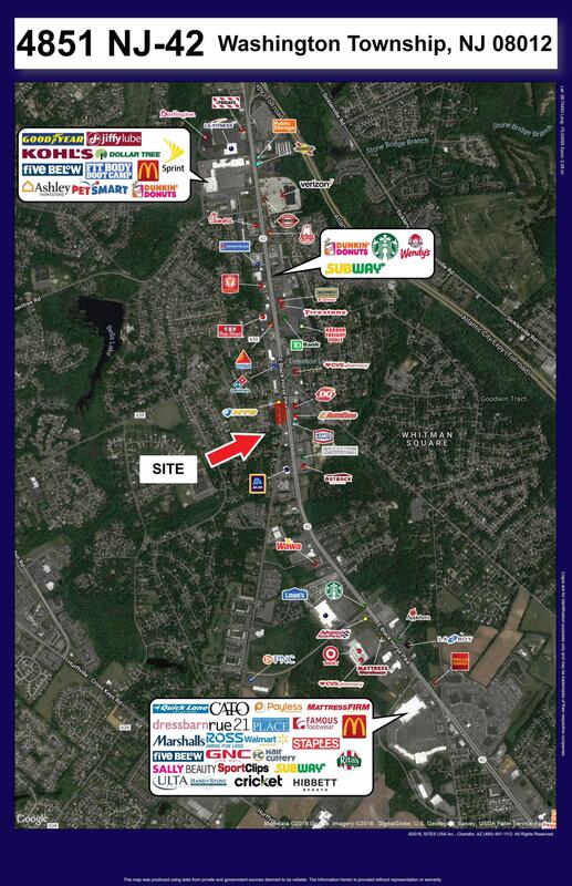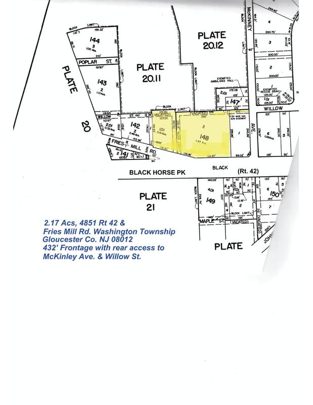 2.17 Acres ground lease or sale, 4851 Rt. 42 (Black Horse Pike) Blackwood, NJ 08012 At the traffic signal, corner of Fries Mill Rd Washington Township, Gloucester County, NJ 190' of frontage 0n Rt. 42 & 240' on Fries Mill Rd.Up to 75% owner financingThe number of cars passing by the site per day: 51,093 CarsZoning: Highway Commercial Letter of interpretation on file: No wetlandsEasement access to McKinley Ave. & Willow St. from behind MidasCity Water & Sewer Combination of 2 lots: 1.56 Acres + 0.61 Acre Vacant Land, ready for development. Will subdividePopulation: 179,473Avg Household income $116,659 $130,066 $112,330