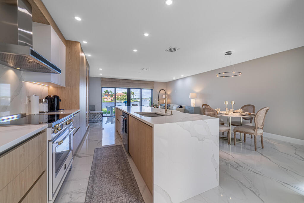 Direct Intracoastal Townhouse - Available for 4 month Seasonal or Annual rent.This beautifully renovated townhouse on Palm Beach Island is ready for immediate occupancy.The residence offers a highly desirable layout with a guest bedroom and full bath on the main level, and a spacious primary suite upstairs. From the moment you step through the gated front patio, you'll feel at home.Inside, stunning 48x48 porcelain tile floors create a seamless, expansive feel throughout the living area. The open kitchen is outfitted with top-of-the-line stainless steel appliances, custom cabinetry, and quartz countertops, with a large island overlooking the living and dining spaces. Floor-to-ceiling sliding doors on both the east and west sides fill the home with natural light and open