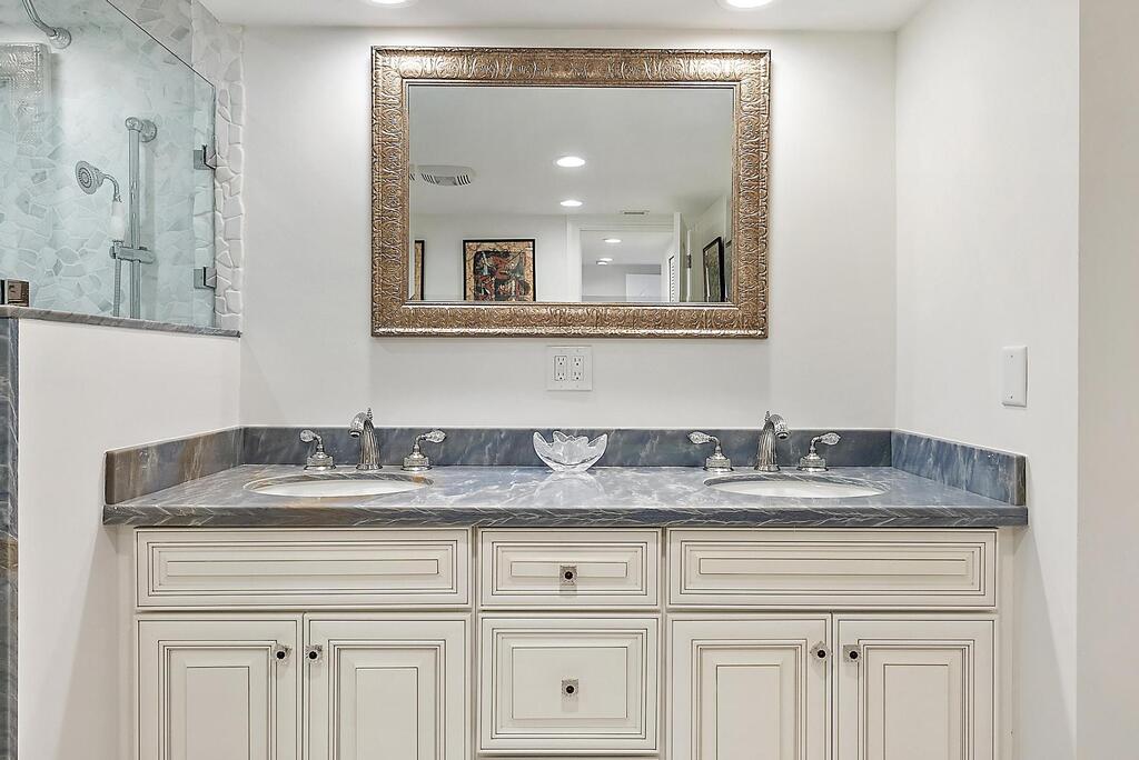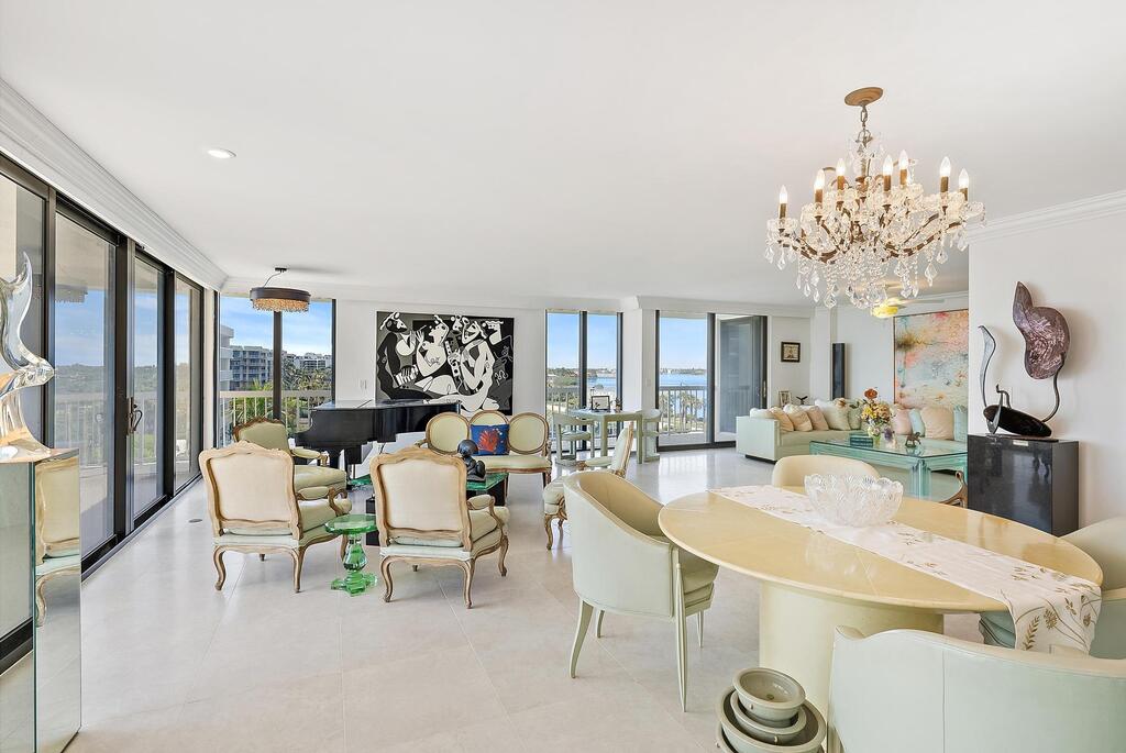 Enjoy breathtaking ocean and Intracoastal views from this beautifully renovated and fully furnished 2-bedroom + ''den-area'', 2.5-bath residence at the prestigious Meridian in Palm Beach. This spacious apartment features newly installed porcelain tile flooring, a sleek open-concept kitchen with custom cabinetry and stainless-steel appliances, and elegantly furnished, which is immaculately maintained. The thoughtfully designed layout includes two en-suite bedrooms and a 3rd bedroom that has been incorporated into the living room. The bright and airy living space opens to two private balconies--one with southeast exposure offering sweeping ocean vistas, and the other showcasing stunning direct Intracoastal views, allowing one to enjoy both sunrise and sunset views. The primary suit