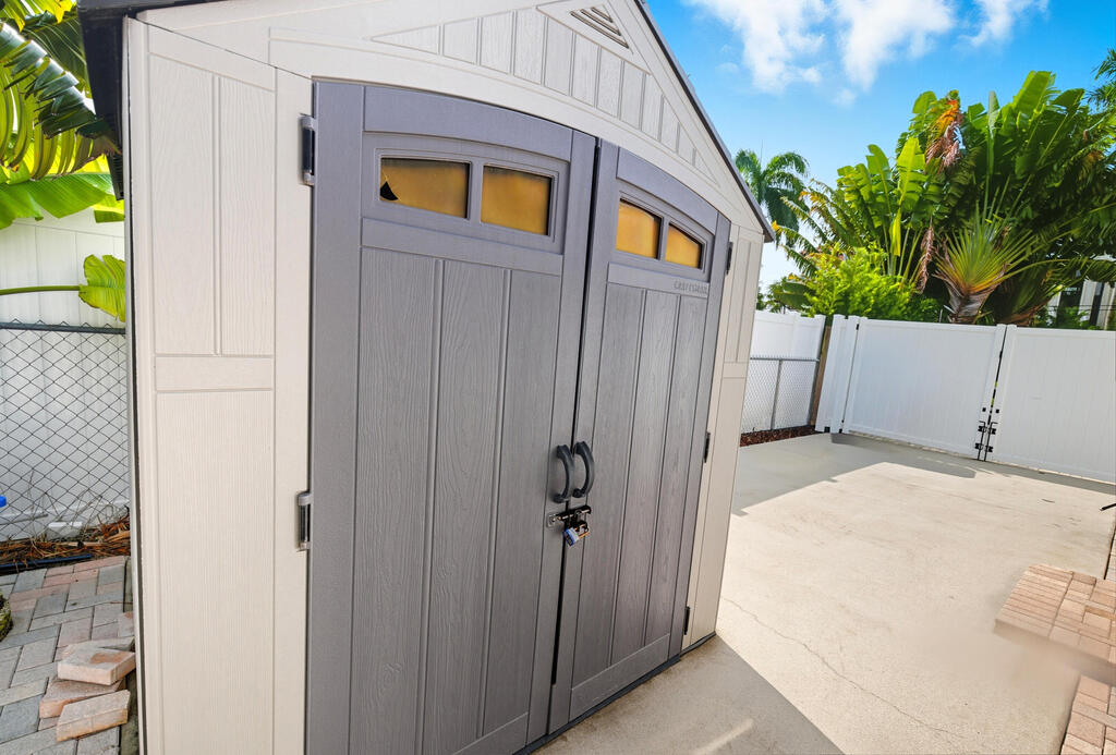 - Exterior FeaturesAuto Sprinkler, Cabana, Covered Patio, Fence, Fruit Tree(s), Screened Patio and Shutters