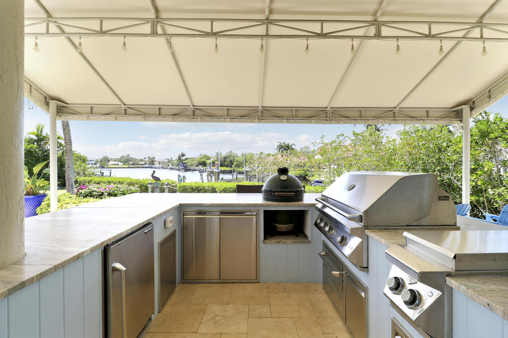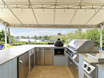 - Exterior FeaturesAuto Sprinkler, Built-in Grill, Covered Patio, Fence, Open Patio and Summer Kitchen