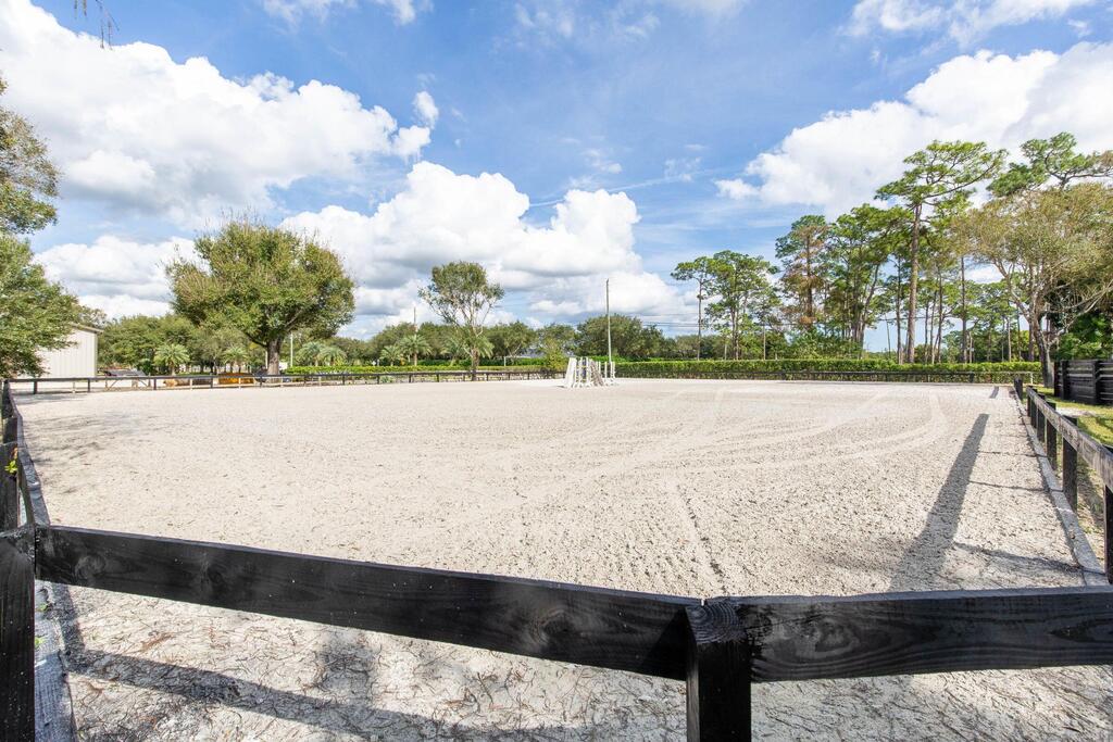 This serene equestrian farm has an amazing location just across Southern Blvd on a paved road and is only about a 10 minute drive to WEF. The house has its own private gate & driveway, and includes 3bdr/2bath with an additional 4th bedroom added in the garage (can easily be converted back). Fully furnished with a fenced in backyard for your 4 legged friends! There is one 6-stall barn and one 10-stall barn, an all-weather 150 x 120 ft GGT arena (bigger arena at neighbors might be available for an additional cost), a 60' round pen and 5 grass paddocks. Treadmill shed, 5 wash racks, two RV hook-ups, separate storage for hay & shavings and plenty of space for parking. The property is located just across the street from Loxahatchee Groves Park which has great walking and riding trails!