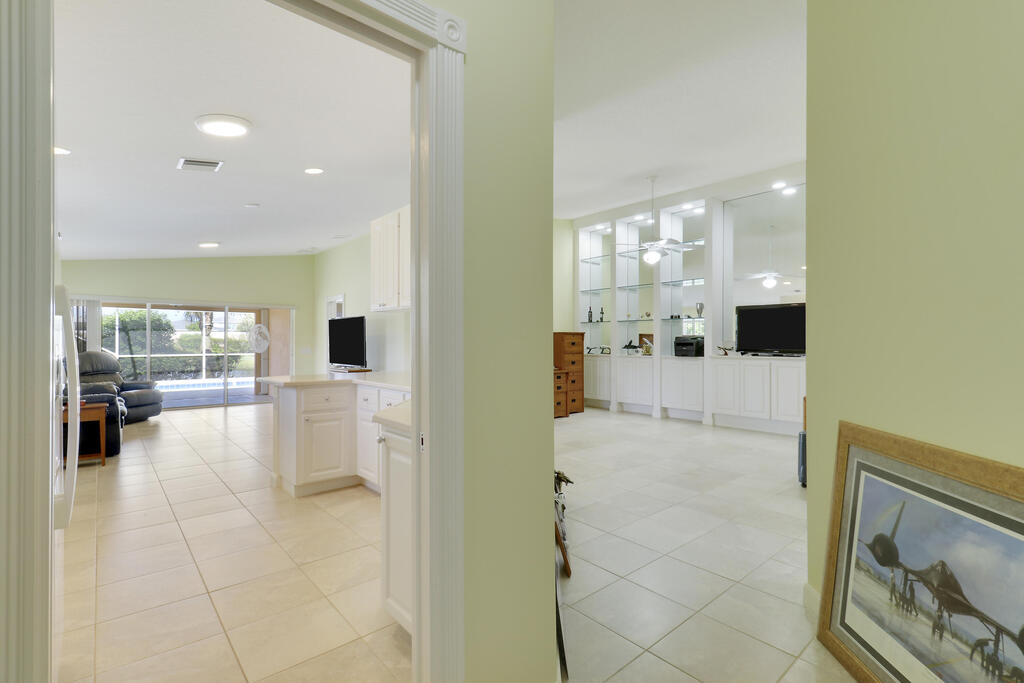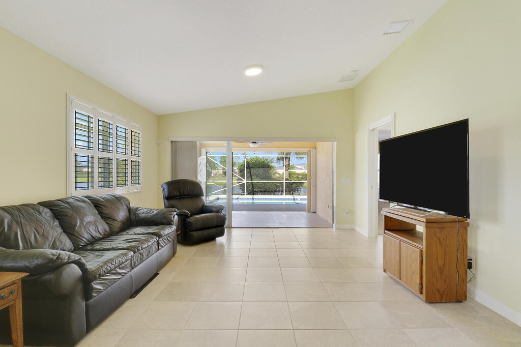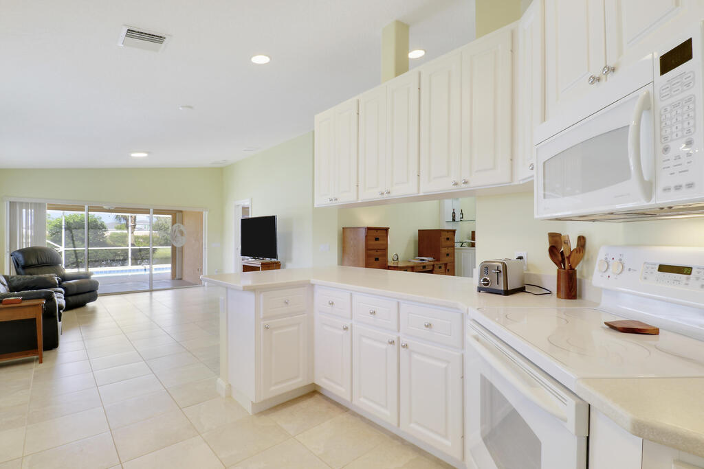 LOCATION, LOCATION! ENJOY BEAUTIFUL SUNSETS FROM THIS 2BR/2BA/2CG VILLA WITH PRIVATE POOL SITUATED ON AN INCREDIBLE, OVERSIZED, LAKEFRONT LOT! Offered for annual, unfurnished rent! This lightly lived in home features an open floor plan, poured concrete construction, vaulted ceilings, tile flooring throughout the main living areas, carpeted bedrooms, plantation shutters, garage storage, a built in wall unit with display shelves in the living area, newer pool heater (2021), newer pool pump (2023), new water heater (2024) and a newer AC (2018). Both bedrooms can be closed off as suites and there is built in shelving in each closet. Whole house accordion shutters make storm preparation a breeze!