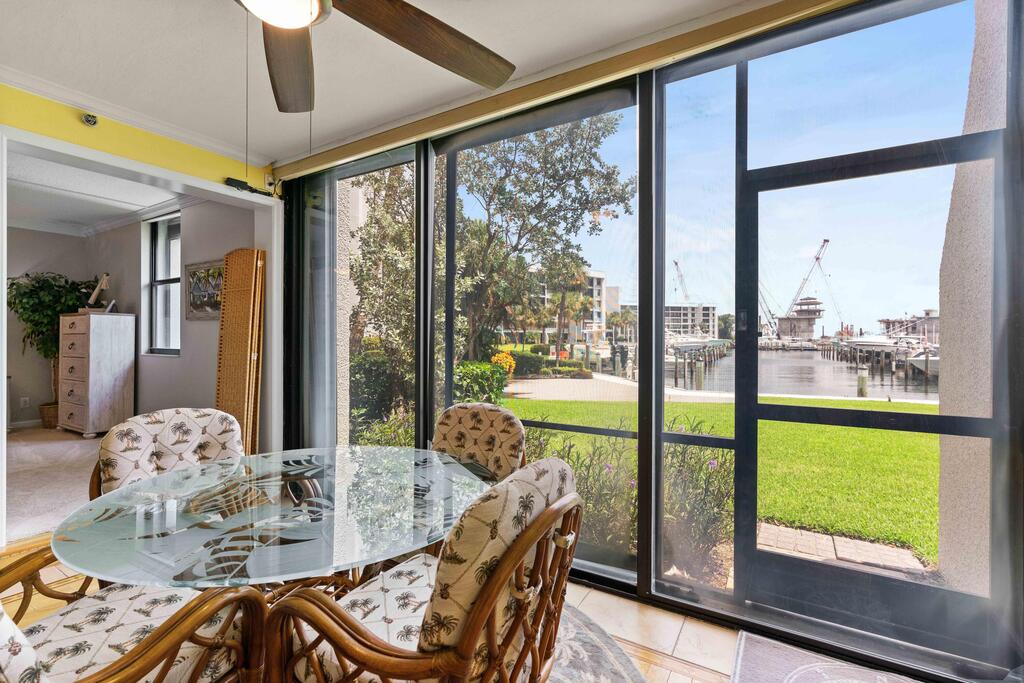 This stunning condo in the heart of Jupiter is available for rent at $3,995 per month during the off-season and $5,995 per month for the 2026 season. It presents a remarkable opportunity to experience the best of Jupiter, with breathtaking water views that can be enjoyed all day long. The fully furnished, turn-key 2-bedroom, 2-bathroom unit features an extended floor plan that includes an additional full den/office, providing a spacious layout reminiscent of a home.The ground floor unit boasts beautiful wooden flooring throughout and is bathed in natural light, with direct views to the East and Southeast. Jupiter cove is an amazing property with over 17 acres of land, the activities are endless. Enjoy the Jupiter lifestyle with top notch dining, and close proximity to PBI Airport!
