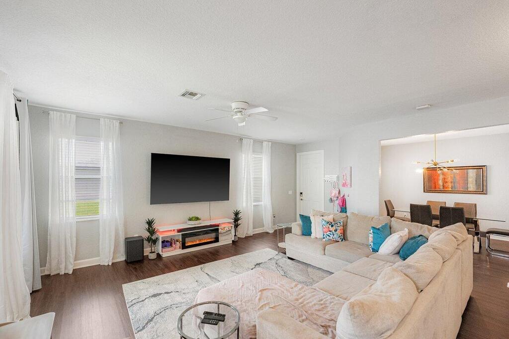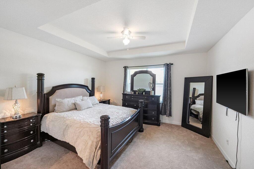 This SPACIOUS residence features 3 Bedrooms plus a DEN/OFFICE, Can be used as Home Office or easily converted into a 4th Bedroom. ALL NEW CARPETS AND WOOD FLOORS PLUS ACCORDION SHUTTERS. Roof, Appliances and A/C as NEW- BUILT IN 2019. The master suite is a retreat, showcasing elegant tray ceilings, expansive walk-in closets, and a spa-like ensuite with dual sinks for added convenience. On the opposite side of the home, you'll find the two additional bedrooms and a dedicated laundry room, thoughtfully placed for privacy and functionality. Step outside to your backyard oasis, where a semi-fenced patio invites you to relax, entertain, or grill the perfect steak in a peaceful, private setting. Enjoy resort-style living. The community offers amenities for the whole family.