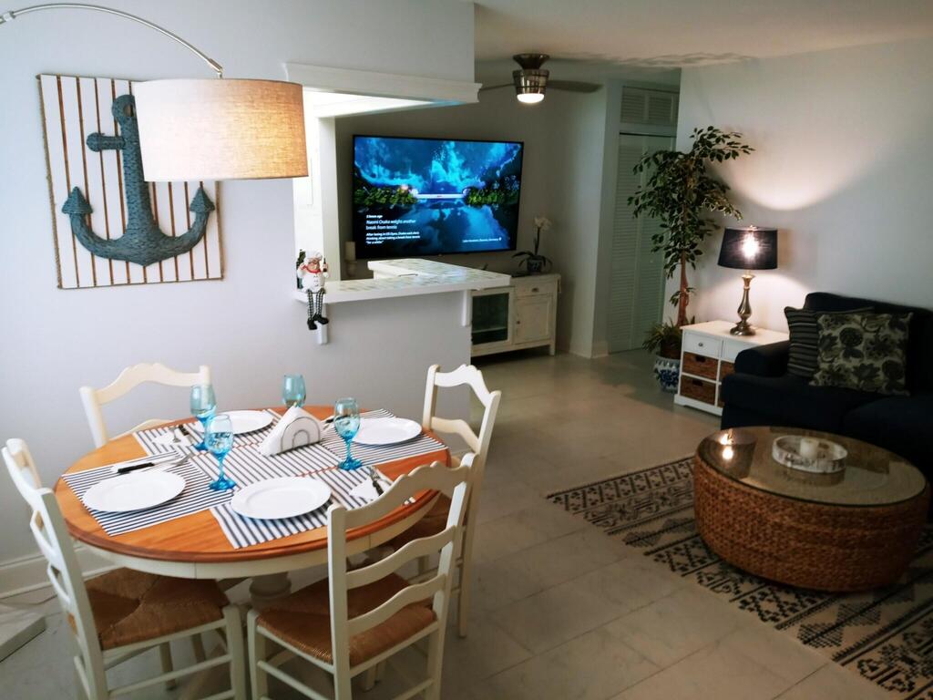 Beach lovers dream! Totally turn key 1 bedroom 1 bath ground floor apartment. Steps away from the beach.Fully furnished includes tile floors, full kitchen, washer and dryer, large bedroom with queen bed and flat screen TV, corner sofa includes pull out queen bed, flat screen 80'' TV in living area. independent AC control for living room and bedroom. Screened rear patio for relaxing and enjoying ocean breeze. Private beach is one of the best and widest in the area. Commercial mall within walking distance with restaurants, entertainment and stores.