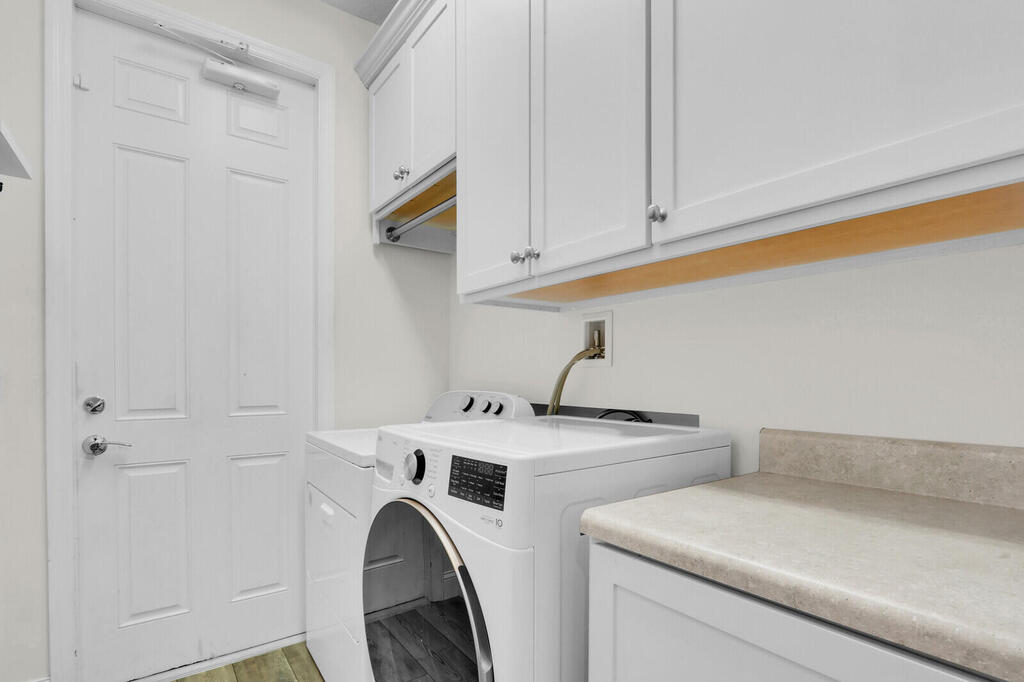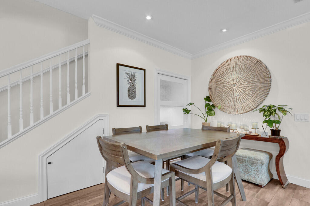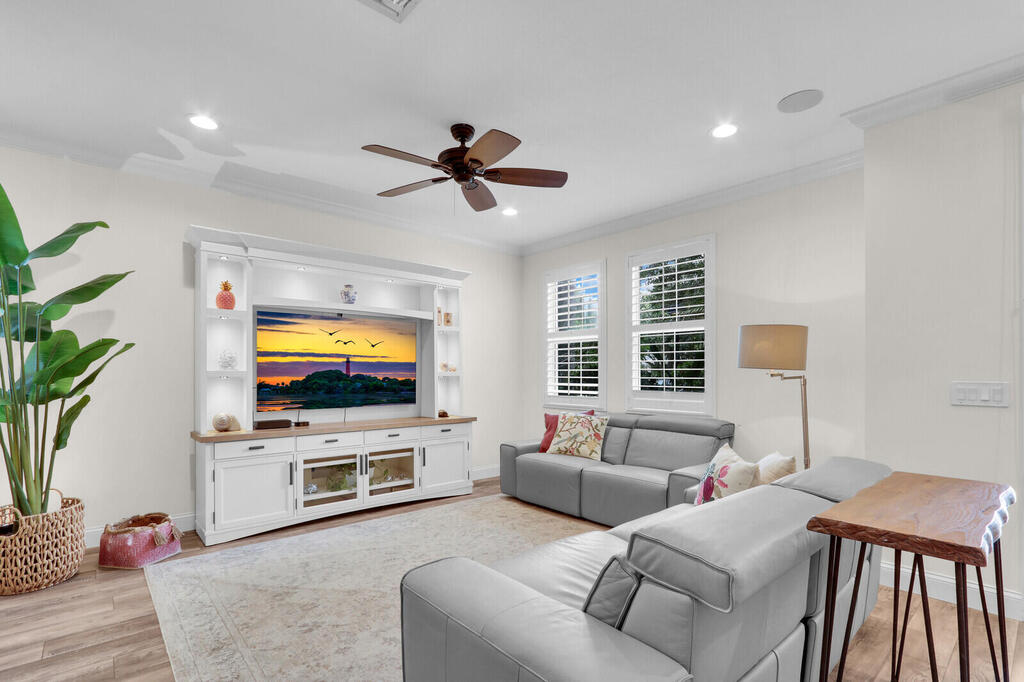 Beautifully upgraded, corner townhome is offered as an unfurnished or furnished ($4,000/month), annual rental in highly desirable Abacoa Windsor Park community boasting a coastal-vibe, remodeled guest bathroom with deep soaker tub, remodeled under stairwell converted to office with counter space and filing system drawers separated by beautiful sliding glass door, additional storage space with door passage under stairwell, crown molding and high baseboard, plantation shutters, light wood vinyl flooring, kitchen undermount lighting, surround sound speakers and wiring, insta-hot tankless water heater in garage for space and energy conservation, plus additional recess and accent lighting in living room. Ceiling fans in every room and ADT security system monitoring included