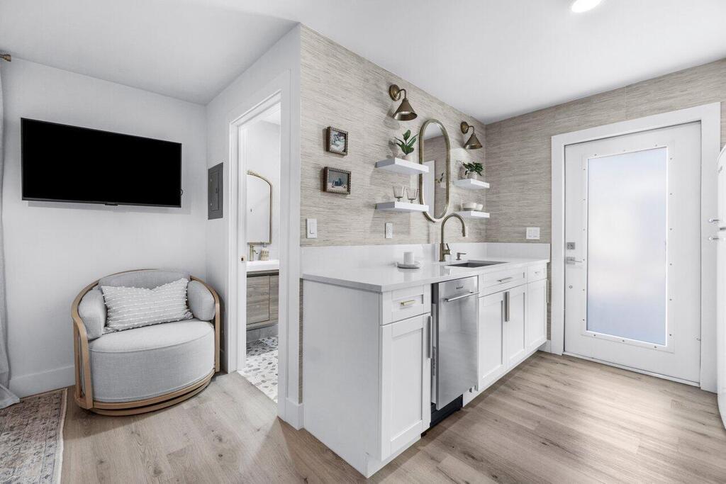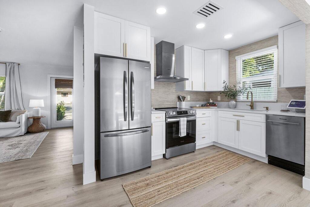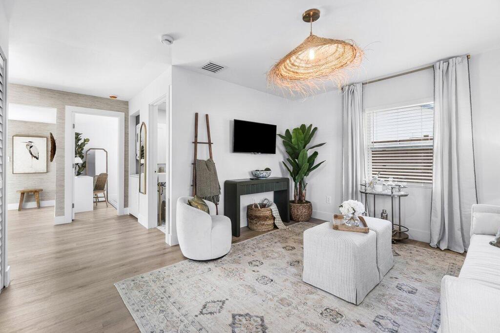 Fully Renovated single family home located 2 blocks off the intracoastal in the historic neighborhood of Northwood Harbor that is experiencing significant development growth. Main house features 2 bedrooms, 1 bath, with central a/c and utility closet. Detached studio apartment with 1 bath, full kitchen and mini split. Both units are fully permitted with brand new plumbing, electrical, stucco; impact windows and doors. Featuring recessed lighting, quartz countertops, stainless steel appliances, professionally landscaped grounds with new sod and underground sprinkler system. Fenced backyard with space for a pool. Some of the planned and approved developments just minutes away include: Alba, Olara, The Ritz Carlton. Beautiful rental property with flexible terms.