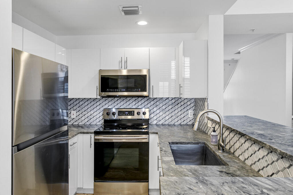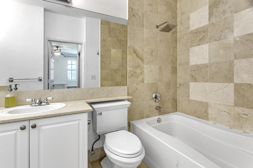 Wonderful CitiPlace location! Walk out your door and be in the middle of all that West Palm Beach has to offer - including great restaurants, many shops, gyms, a Publix, office towers and more! This 3 story townhome is freshly painted and has gleaming marble floors throughout. !st floor has an office/den/bedroom with a powder room and direct access to your own private 2 car, gated garage. 2nd floor - large living room, dining room and an open kitchen with laundry.3rd floor is the primary suite with a large bedroom with built-in shelving, walk-in closet and a full bath, and there is a second en-suite bedroom with a full bath. And the community has a gated, community pool too!