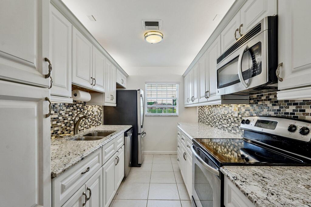 This immaculate 55+ villa is being offered both seasonally and annually. Seasonal rental is available for a minimum of 4 months. This unit features a large one bedroom but also has a Florida room which could be utilized as an office/den. Upgrades throughout the unit including kitchen cabinetry, granite counter-tops, stainless steel appliances, LED lighting, and a beautiful backsplash. The bathroom features Silestone counter-tops, glass doors, sinks and fixtures. There is plenty of bedroom storage featuring two walk in closets. In addition there is wall and linen closet. Enjoy the stackable washer/dryer and upgraded window treatments. This unit is perfect for the person who wants to enjoy the Florida weather and escape the cold.