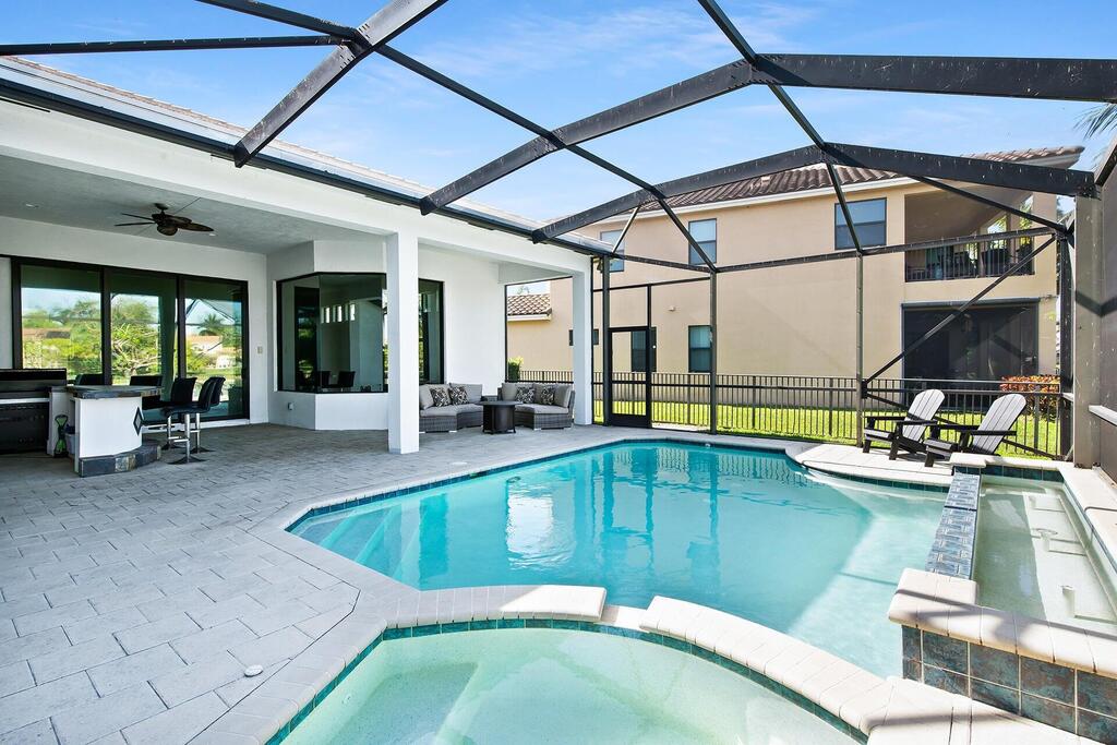 Discover lakefront luxury in the prestigious gated community of Boca Reserve. This beautifully upgraded home offers over $200,000 in premium enhancements, featuring 5 bedrooms, 3.2 bathrooms, and an expansive open floor plan designed for modern living. The first floor boasts three spacious bedrooms, including a serene primary suite with stunning lake views. The chef's kitchen is a showstopper with granite countertops, stainless steel appliances, wood shaker cabinetry, and a large pantry. Upstairs, two additional bedrooms include one with a private balcony overlooking the tranquil lake. Outdoor living shines with a fenced yard, a screened pool and spa, a summer kitchen, and ample space to entertain. This home also includes impact windows and a 2-car garage.