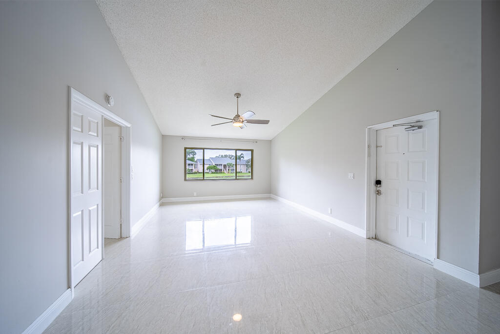 Completely updated lakefront condo in Pine Ridge at Delray Beach, close to many shopping centers, restaurants and entertaining! This beautiful second floor unit boasts THREE bedrooms, 2 bathrooms, vaulted ceilings, a fully renovated kitchen with waterfall quartz countertops, stainless steel appliances, beverage cooler, and skylight. This home blends style and comfort effortlessly. Gorgeous porcelain floors flow throughout, adding a sleek and modern touch. All bedrooms open to the screened balcony, perfect for relaxing while overlooking the tranquil lake. The master bedroom suite is a true retreat, complete with a walk-in closet and spacious bathroom where you will find a large tub and step-in shower.