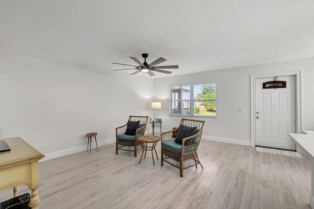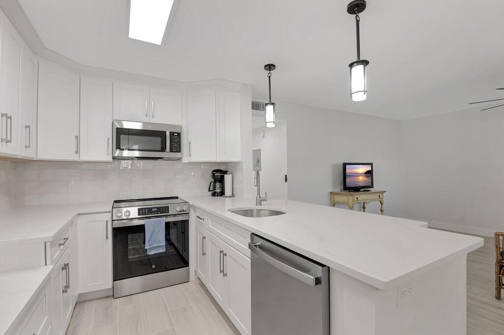 Step into luxury with this completely renovated 2-bed, 2-bath condo at 493 Flanders K, nestled in the vibrant 55+ community of Kings Point Golf and Country Club. RENT RIGHT AWAY NO WAIT! Every inch of this home has been thoughtfully upgraded with top-tier finishes, ensuring a seamless blend of elegance and functionality. This condo features all-new essentials, including a brand-new A/C system, hot water tank, and upgraded electric panel for worry-free living. The stunning open-concept kitchen is a chef's dream, boasting quartz countertops, top-of-the-line stainless steel appliances, a tiled backsplash, and ample natural light. A breakfast bar invites you to pull up a stool and enjoy your morning coffee in style. Freshly painted with smooth ceilings and designer wood-look porcelain tile