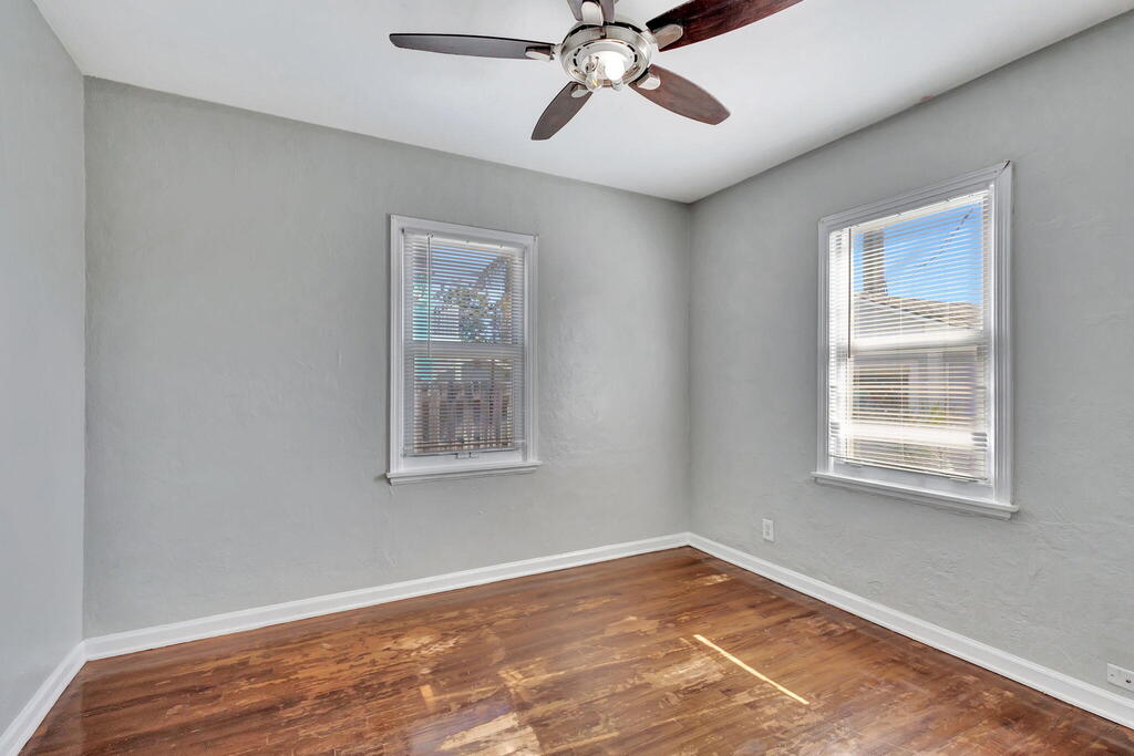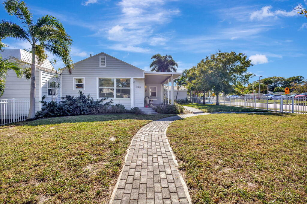 A welcoming covered porch sets the tone for this charming four-bedroom, two-bath home just 5 miles from the beach. Inside, natural light fills the bright and airy layout, highlighted by crown molding, wood floors and a kitchen with crisp white cabinetry, french doors, and a buffet pass-through. Central A/C keeps the home comfortable throughout, with a window unit in the primary bedroom for separate cooling. The fenced yard offers plenty of space for pets or gardening, while shared laundry access adds everyday convenience.This home offers both convenience and charm--all while being minutes from the shops, dining, and vibrant energy of downtown West Palm Beach. Whether you're seeking a serene retreat or a well-located spot close to it all, this is the perfect place to call home.