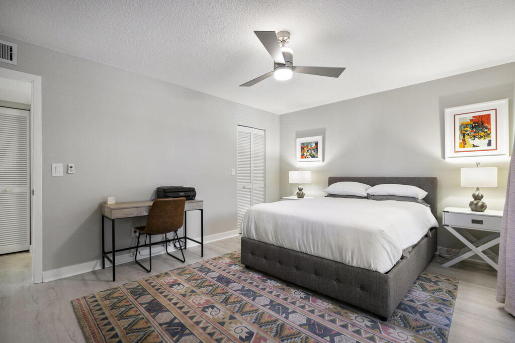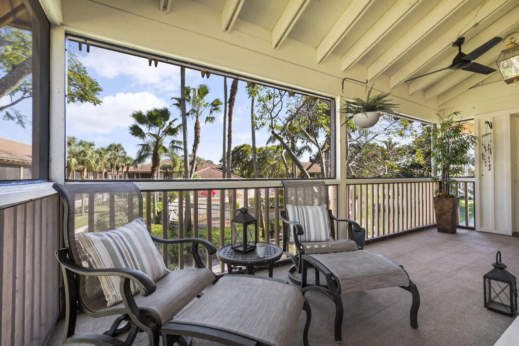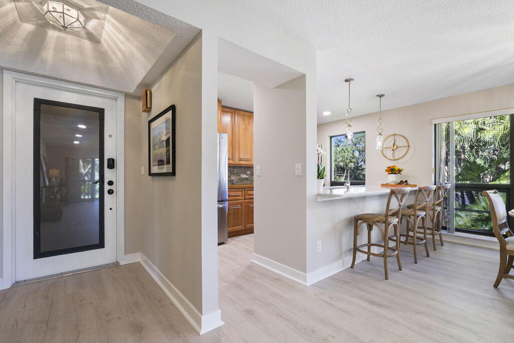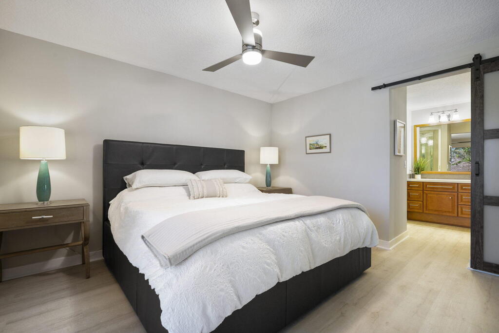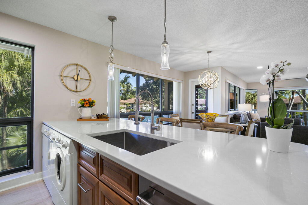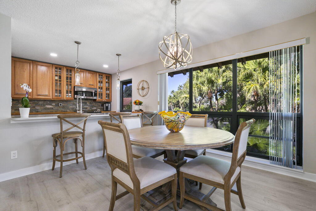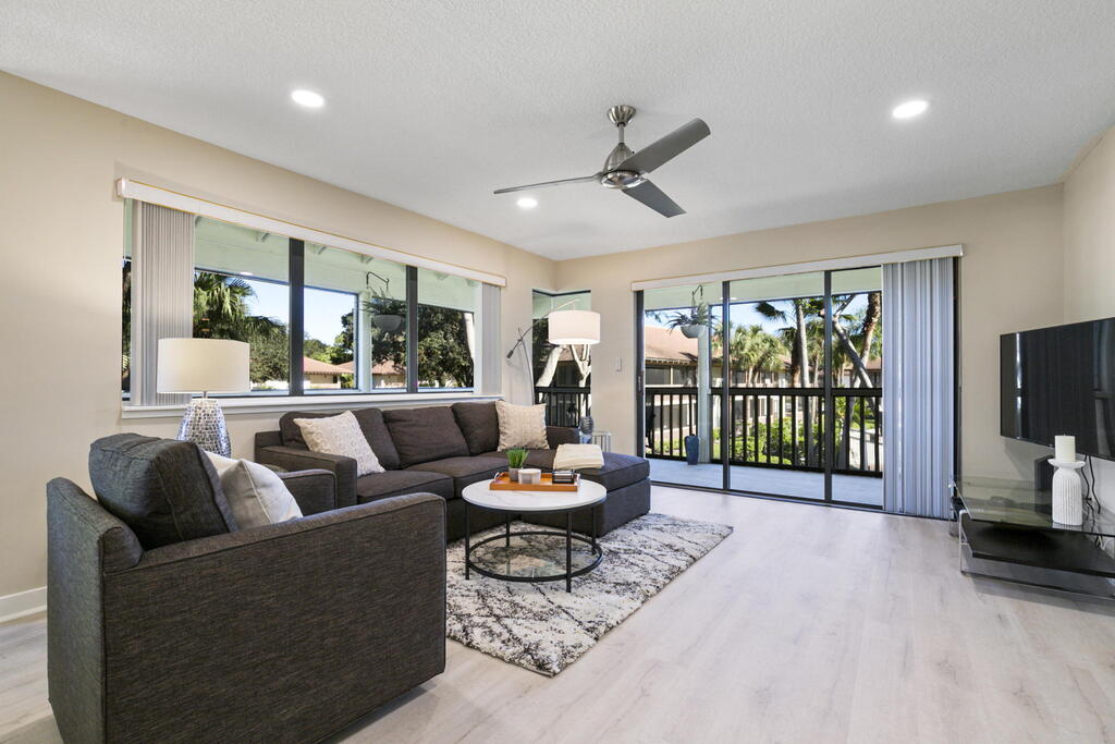 Spend Nov & Dec in this exquisite end unit in the heart of PGA National, where every detail has been thoughtfully curated for comfort & style. Step inside to discover luxury vinyl wood-look flooring throughout, complemented by tiled bathrooms. The fully equipped kitchen, features a quartz countertop w/ stainless steel appliances & front load washer & dryer . This culinary space is not only functional but social, with bar stool seating that seamlessly integrates with the open dining & living areas.Interior & exterior ceiling fans create a bright and airy atmosphere. Elegantly decorated in a modern, relaxing style, this home is furnished to comfortably sleep four.Sip your morning coffee/evening wine on the private, fully screened wrap-around lanai, where tranquility is your backdrop