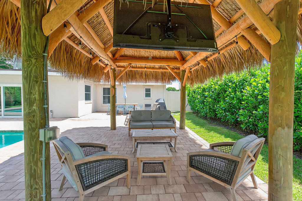 Unfurnished or fully furnished./turnkey. Beautifully renovated 3/2 pool home with 1 car garage in Palm Beach Gardens. Fabulous large fenced back yard, pool w/ large pool deck, Tiki Hut with electric and big screen TV Annual rental only, pool & lawn maintenance included in rent. The light & bright kitchen has been completely redesigned with white shaker cabinets, quartz counters, custom floating shelves & GE appliances. Both bathrooms received a complete makeover with a walk-in shower in the master, tub in guest bath. Vinyl plank flooring stretches throughout the living space & accented by designer tile in the Florida room & laundry room. All windows are impact glass & for added peace of mind a whole house Generac gas generator & tankless gas water heater.