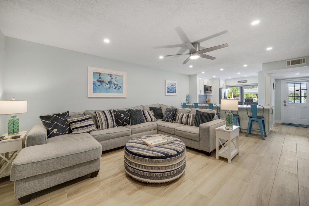 Welcome to Sailfish Village, a charming community ideally situated just minutes from the St. Lucie River, beaches and vibrant downtown Jensen Beach. This 2-bedroom, 2-bath floor plan unit offers a perfect layout for seasonal living. You'll enjoy a full-sized kitchen with coffee bar and sliders to the porch. There's room to entertain in the spacious living room, with sliders to access to the back porch. The primary suite is large enough to include a sitting area for you to relax. The entire unit was recently remodeled. Sailfish Village is an all-ages community with excellent amenities, including two pools, tennis courts, a clubhouse, and a boat club that offers docks for boats up to 21 feet (as available). Minutes to Treasure Coast Mall, boutique shops and a variety of dining options.