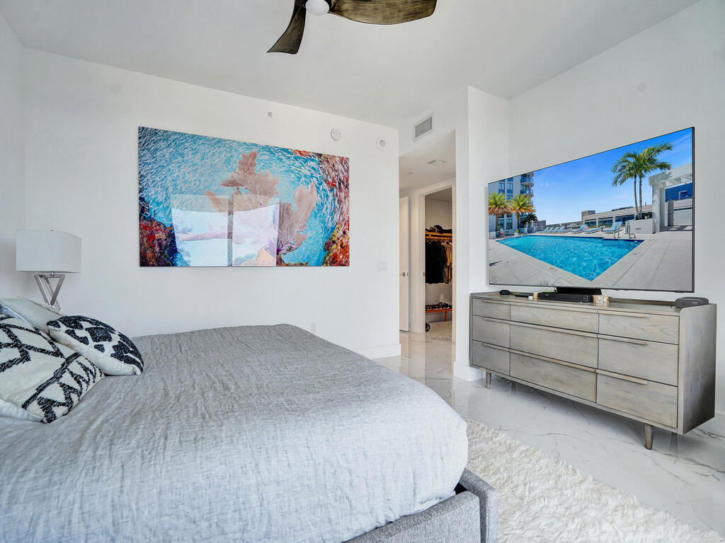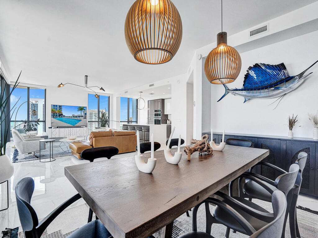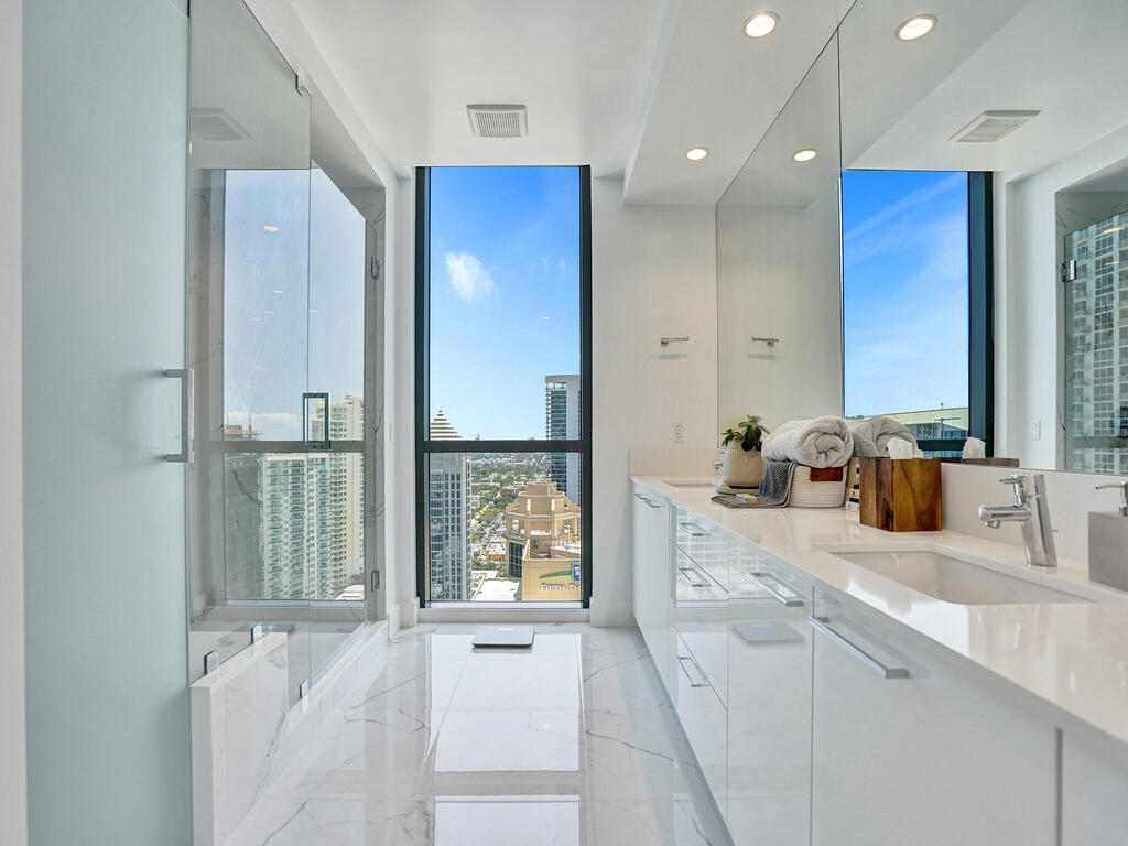 Fabulous sweeping panoramic backdrop of downtown Ft. Lauderdale's City Skyline with River & ocean views from its newest & tallest address, 100 Las Olas with wrap around, curved terrace. Walk to restaurants, shops, night life, grocers, theater & water taxi. From stunning sunrises & sunsets to sparkling city night lights, this highly desirable Model ''A''open floorplan with modern European cabinetry, top of the line appliances, waterfall island, sparkling white tile, Smart tech, remote solar blinds on all sliders & windows has it all! Third Bed is Office with Murphy Bed for versatility. Primary Bed has private balcony, spectacular views, huge walk-in closet seamless glass bath. 2 garage spots. Resort style living incl. pool, full gym, sundeck, grille, coffee room, party room & more.