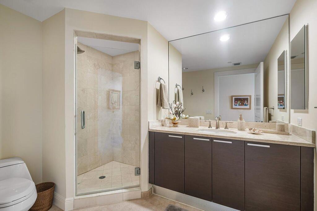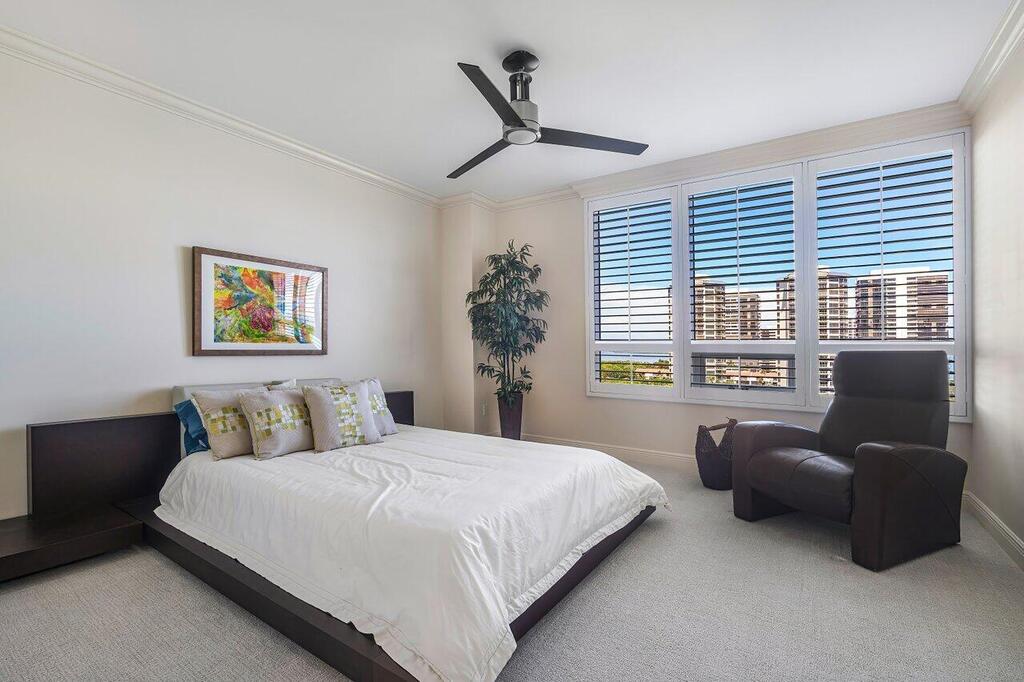 The Private Residences of the Resort on Singer Island. The condominium showcases a split floor plan, encompassing 3 bedrooms and 3.5 bathrooms, with each bedroom featuring an en-suite bathroom and walk-in closet. The kitchen is well-appointed with granite countertops, stainless steel appliances, and a wine cooler. Marble flooring extends throughout the property, which also includes a full-size washer and dryer. Residents enjoy access to the Palm Beach Marriott's comprehensive amenities, such as two pools, a whirlpool, multiple dining venues, a fitness center, Si Spa, a billiard room, social rooms, a movie theater, valet parking, a 24-hour business center, an elevator, a lobby, an on-site manager, a sauna, sidewalks, a spa-hot tub