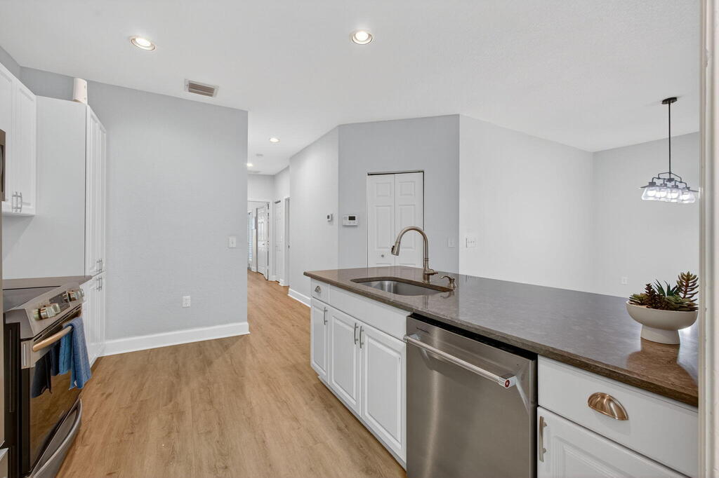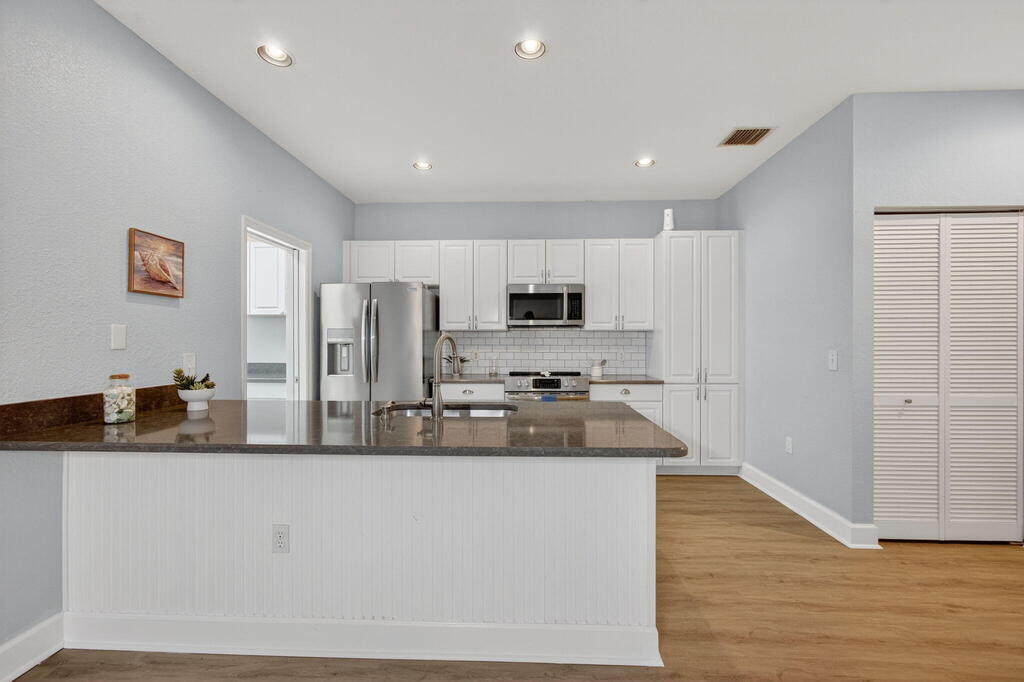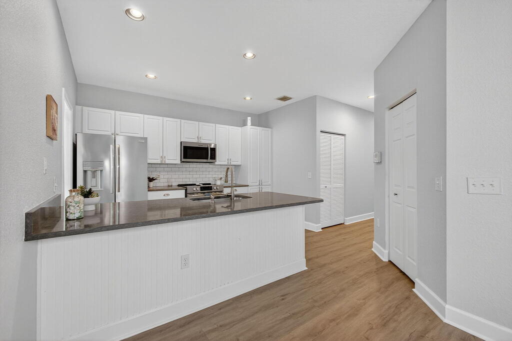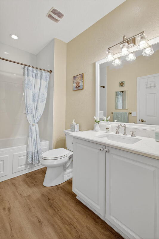 Beautifully Renovated Condo in The Lakes at The Savannahs! This 2-bedroom, 2-bath residence is tucked within a peaceful, amenity-filled community. The open layout showcases a modern kitchen with quartz countertops, stainless steel appliances, subway tile backsplash, and luxury vinyl flooring throughout. The primary suite features dual vanities with quartz counters and a spa-inspired shower with rainfall and full-body fixtures. Additional highlights include custom plantation shutters and a private patio perfect for relaxing outdoors. Exterior upgrades offer retractable screen doors and accordion hurricane shutters. Ideally located just steps from the clubhouse, pool, tennis courts, and fitness center. Shopping and dining are only minutes away! Rent includes water, cable, internet, lawn.