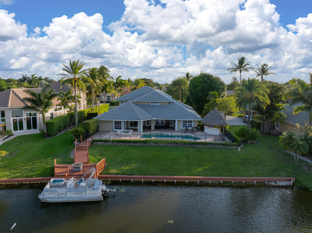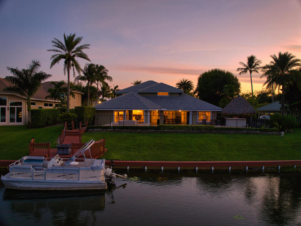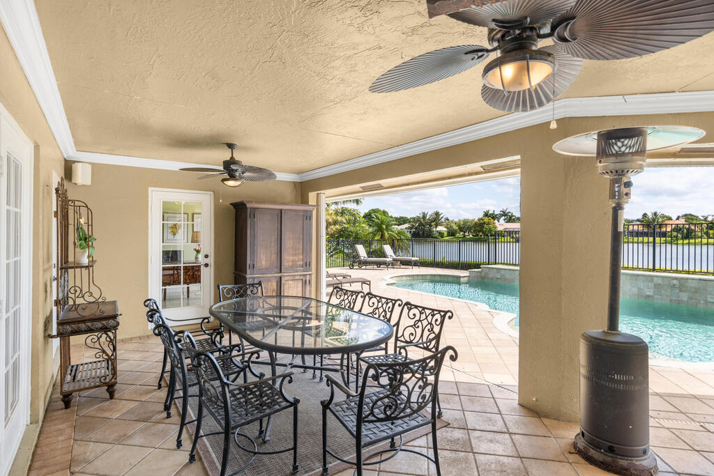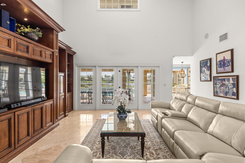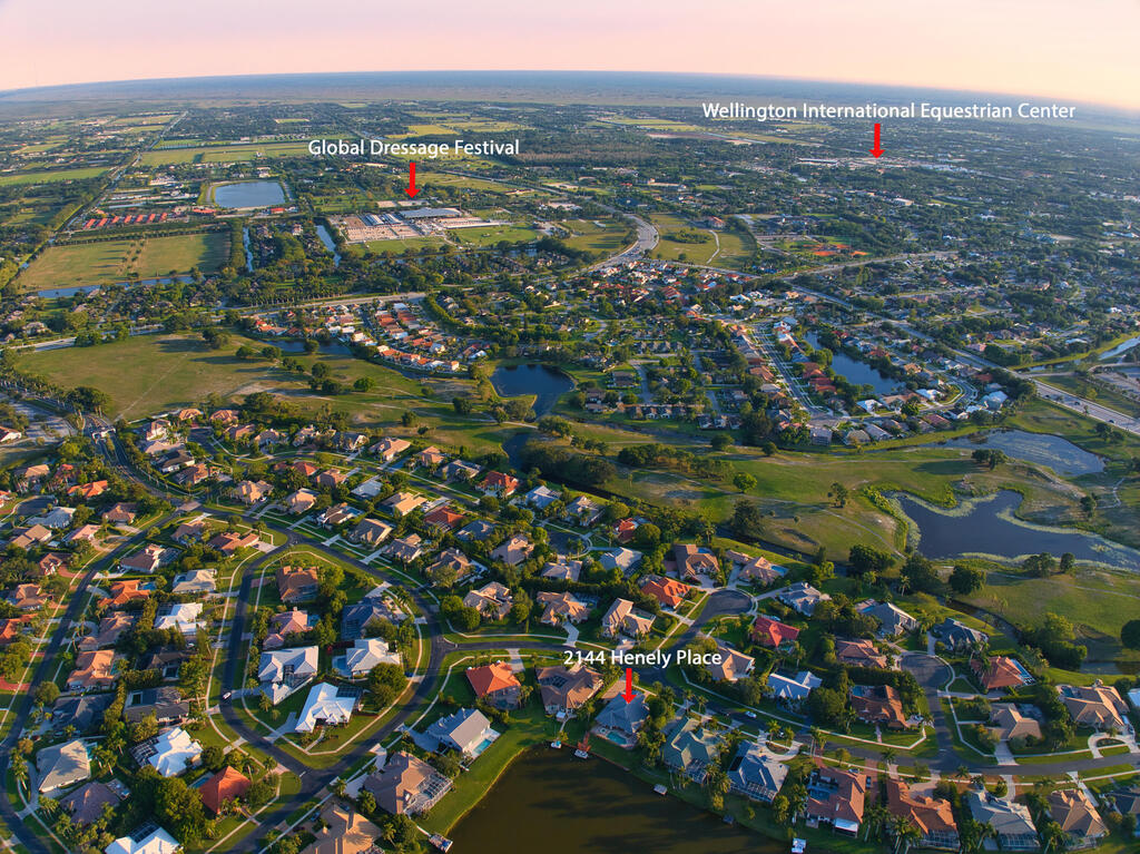 Furnished Seasonal Rental - Enjoy lakefront sunsets from this elegant home in the gated community of Polo West, near Wellington International and Global. Comes with a private dock, 19-ft pontoon boat, and pool table - perfect for waterfront entertaining. Features include double-height ceilings, crown molding, travertine floors, and a spacious first-floor primary suite with Brazilian wood floors and a luxe onyx-accented bath. The gourmet kitchen offers Viking appliances, granite counters, and a breakfast nook with lake views. Upstairs has two bedrooms with a Jack & Jill bath; one guest room is downstairs. Outdoors: covered patio, Tiki bar, summer kitchen, saltwater pool/spa with waterfall. A rare blend of luxury and equestrian living. Some pictures are virtually staged.