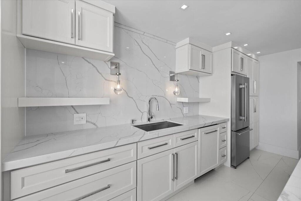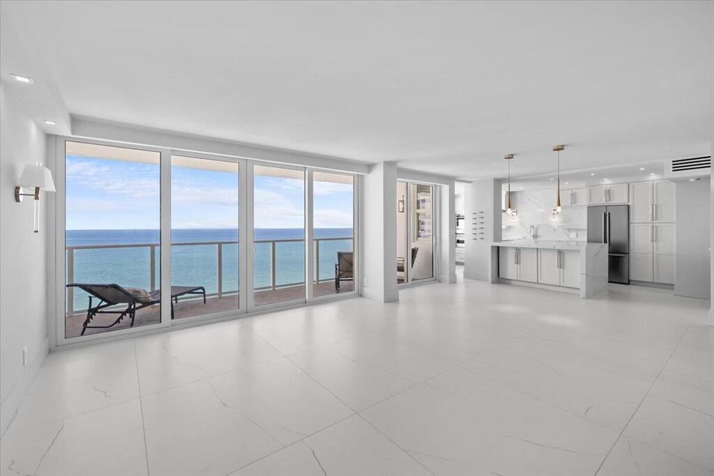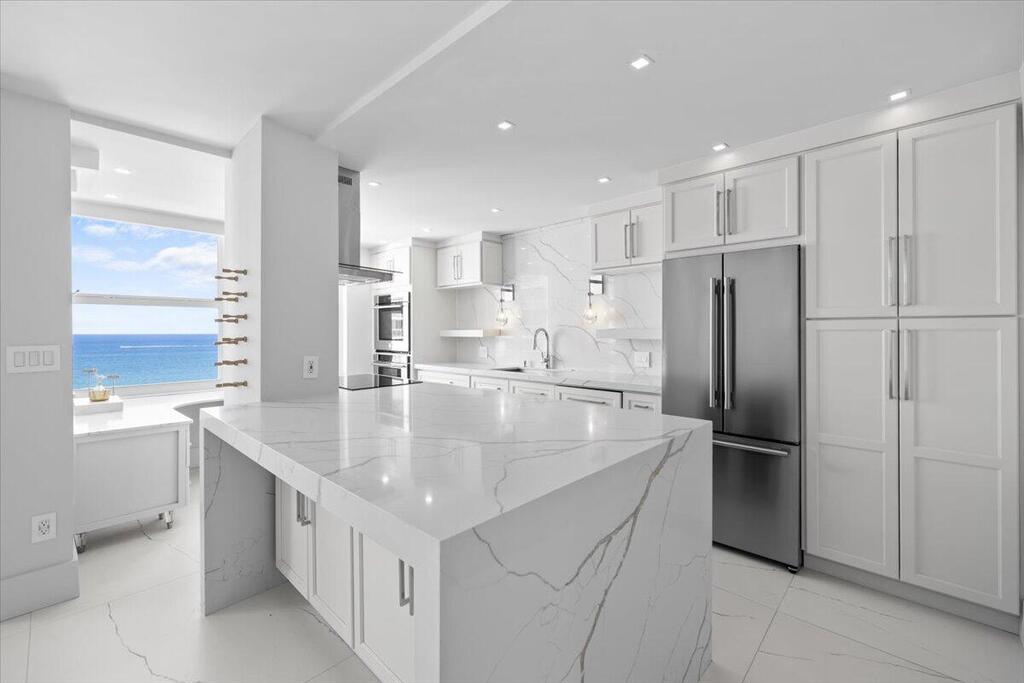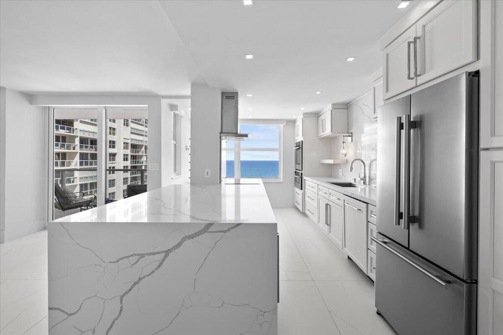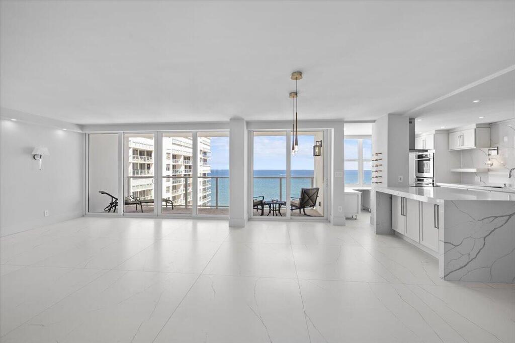 Welcome to Residence 15D at the prestigious Plaza East on Fort Lauderdale's Famous Galt Ocean Mile. This fully renovated 2-bedroom, 2-bathroom oceanfront residence offers breathtaking, unobstructed views of the Atlantic Ocean and Intracoastal Waterway from the 15th floor. Thoughtfully designed with high-end finishes and custom features throughout, this home combines modern coastal elegance with luxury living. The open-concept kitchen is a showstopper, featuring custom white shaker cabinetry, premium Forno European-designed stainless steel appliances, quartz countertops, and a stunning waterfall-edge peninsula ideal for entertaining.