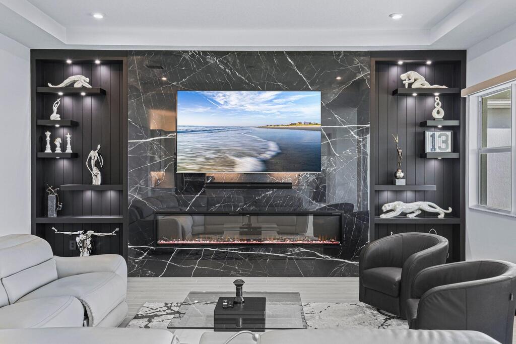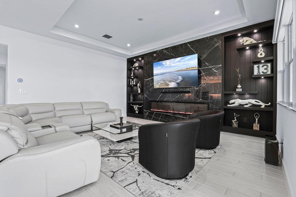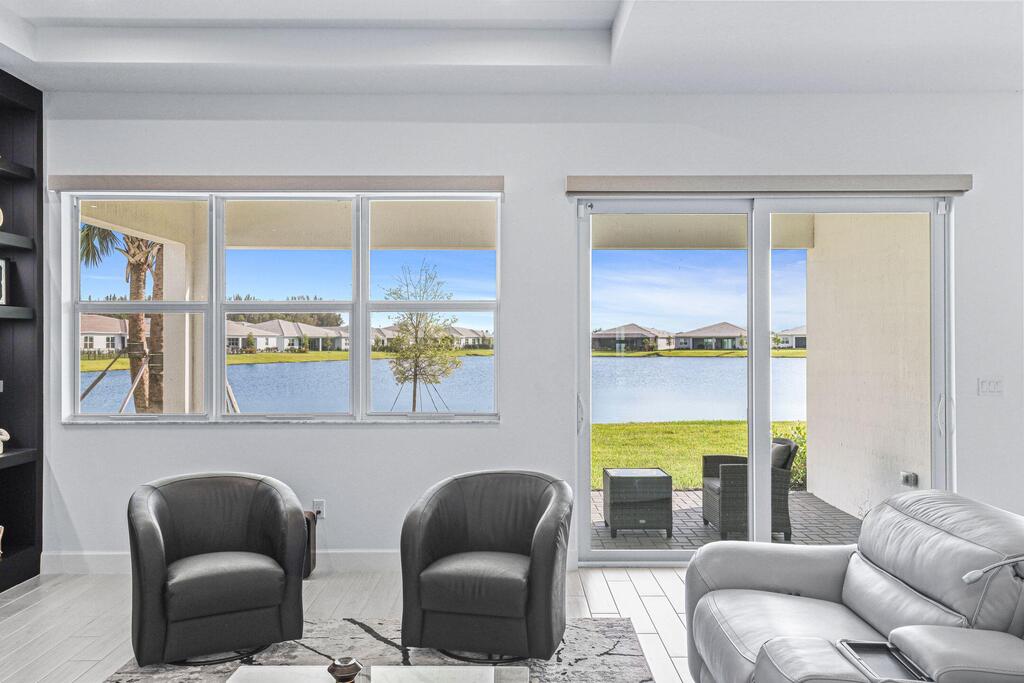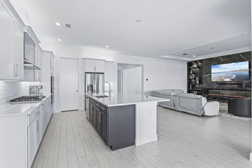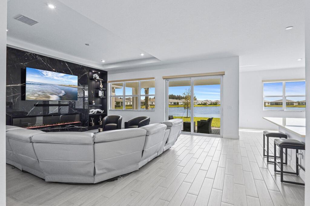Luxury Living in Seville - A Rare Corner Homesite with Long Lake ViewsImpeccably crafted in 2024, this elegant residence showcases refined finishes, timeless design, and one of Seville's most desirable corner lots. With expansive long lake views as the backdrop, the home offers a perfect blend of sophistication, comfort, and serenity.Inside, soaring ceilings and oversized wood-look tile floors create a bright, airy atmosphere. The open-concept great room is anchored by a striking custom porcelain fireplace and triple sliding glass doors, seamlessly connecting indoor and outdoor living.The gourmet kitchen is both stylish and functional, featuring quartz countertops, sleek cabinetry, double wall ovens, and a gas cooktop--perfect for everyday living or entertaining. The owner's suite