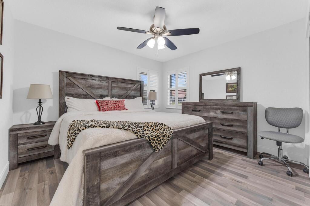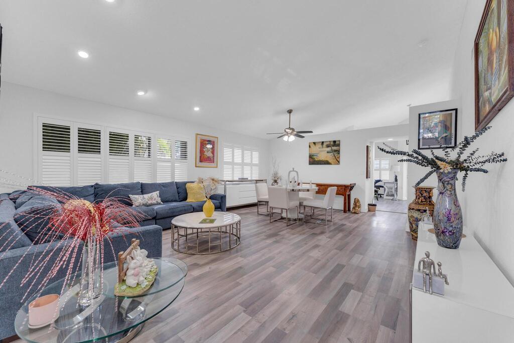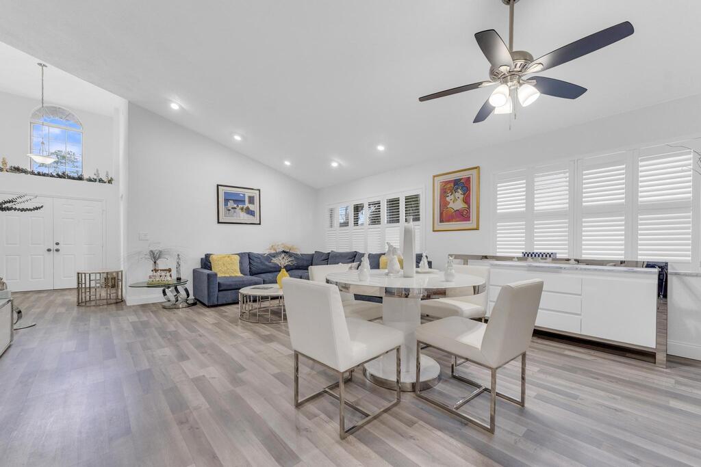 Beautifully updated and turnkey 2-bedroom, 2-bathroom villa with a 1-car garage and stunning lake view. Updates include newer kitchen cabinets with granite countertops, plantation shutters throughout, and impact glass on sliders and kitchen windows. The primary bathroom features dual sinks and granite countertops. Enjoy newer bathroom vanities, tile wainscots, toilets, wood and tile flooring, light fixtures, and hardware throughout. Vaulted ceilings and large windows add character. The owner offers a 1-year guarantee on all appliances. The front yard is professionally landscaped. Includes a pantry, his and her closets, and a coat closet. The roof is from 2024. Enclosed patio area with lake view. 55+ community close to shops, highways, and entertainment.