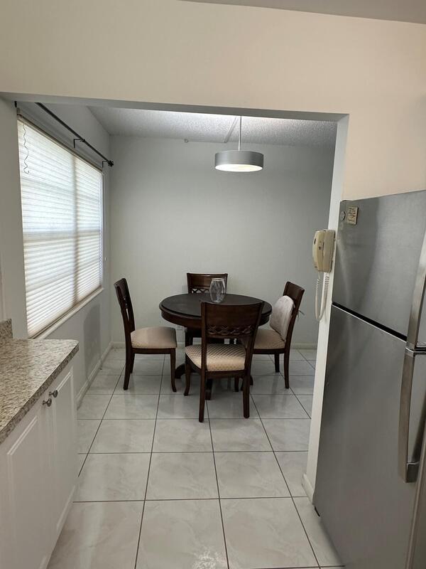 Immaculate, 1st Floor, light and bright CORNER unit in popular 55+ Century Village Boca Raton. Ready to move in. Existing furniture available. Updated kitchen has raised panel cabinets, granite look counters, and newer appliances. Beautiful tile throughout. Newer vanity in master, updated half bath. Large bedrooms. Walk-in closet. Screened patio with beautiful tiled floor and security pull-downs. Large storage closet on patio. Near laundry room. Close to bus stop. Monthly rent includes water, basic internet, trash disposal, and basic cable. Enjoy all of the wonderful amenities that Century Village has to offer - fabulous clubhouse, pools, shows, activities.