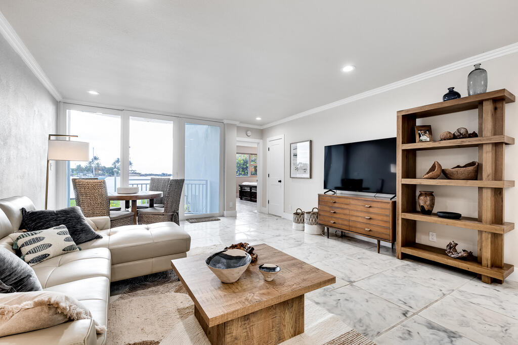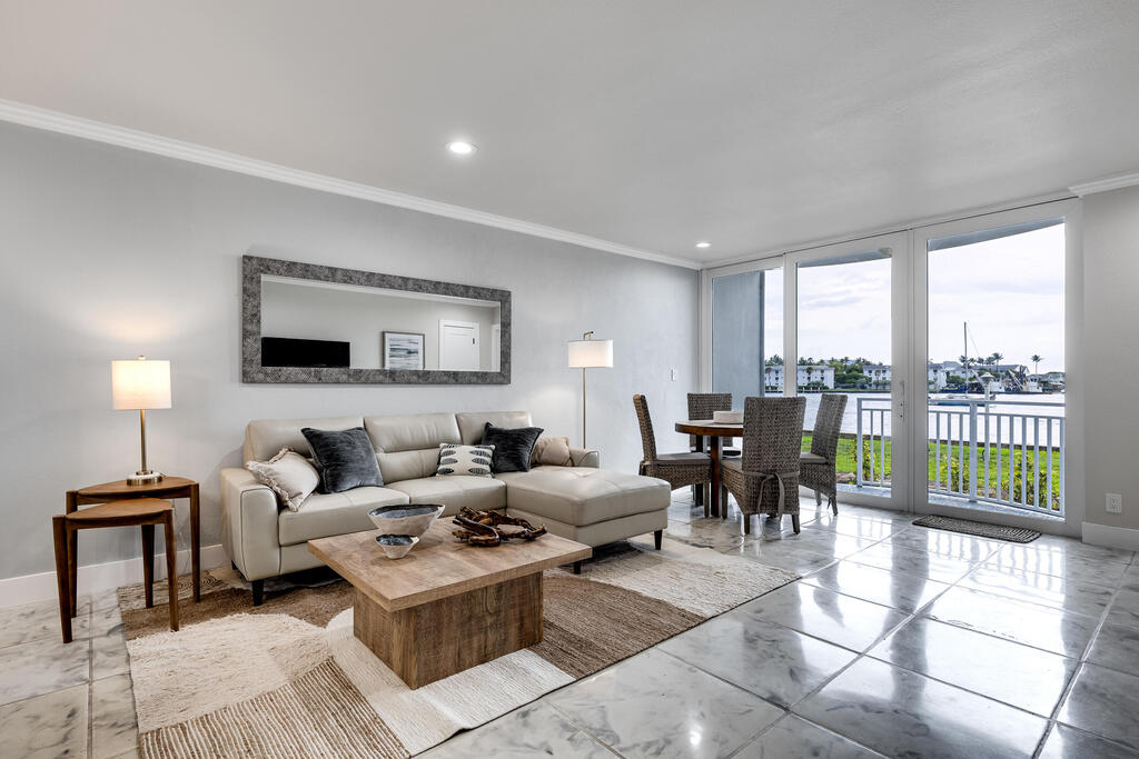 First Floor unit with Spectacular Waterfront Views of Hillsboro Lighthouse / Inlet & Atlantic Ocean! Stunning Balcony Sunsets on private porch. Private Sandy Beach access.1 block to water taxi, charter fishing/scuba/snorkling fleets & restaurants. Community pools, shuffle board, laundry facilities. Thoughtfully-designed 1,142-sq. foot layout w/ open-concept living area. Natural light flows into kitchen/dining space. This space is perfect for relaxing evenings and entertaining. Fully-equipped kitchen includes all necessary appliances, essential cookware, utensils. Choose between a large countertop with barstools where you can share morning coffee or casual meals or go alfresco on the waterfront patio. King master w/ panoramic water views. All utilities included except cable and internet.