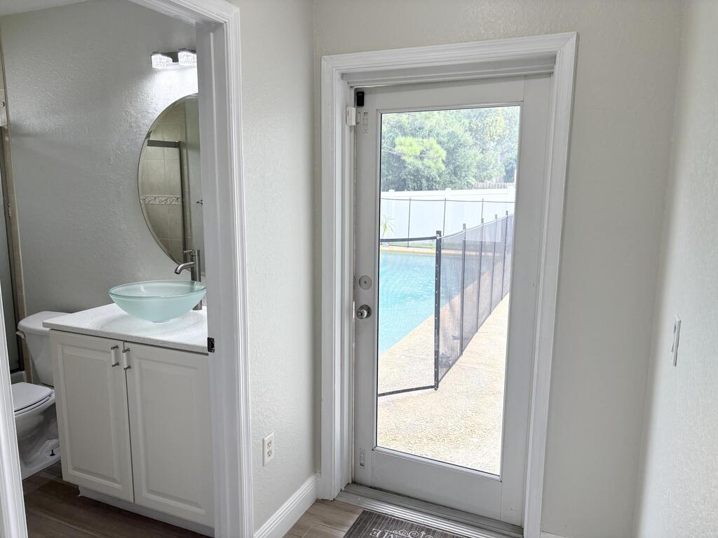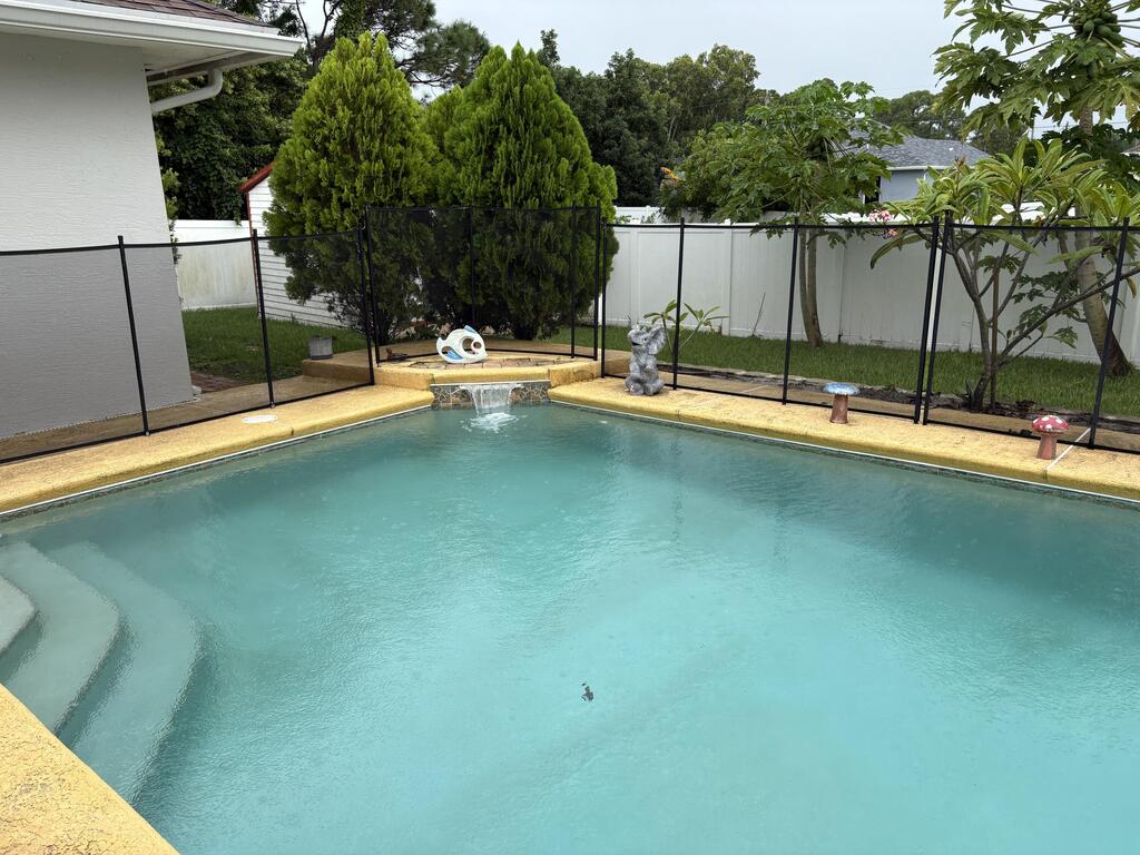 This stunning and spacious 4-bedroom, 3-bath, 2-car garage pool home offers luxury living at its finest. The home features numerous upgrades throughout, including high-end appliances and beautiful quartz countertops in the kitchen and bathrooms. Elegant tile flooring flows seamlessly through the entire home. The master suite includes custom California closets and a spa-like bathroom with a separate soaking tub and walk-in shower. Perfect for entertaining, the home boasts a cabana bath leading directly to the sparkling pool and a large covered patio ideal for outdoor gatherings. The oversized, fenced-in yard provides plenty of privacy and includes a shed for extra storage. A circular driveway adds convenience and curb appeal, making access to and from the and from the home effortless.