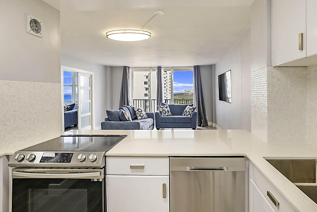 Multi million dollar views from this beautiful one bedrooms condo facing South. This unit has been updated with an open modern kitchen, seating under the bar area, spacious dining and living area. The bedrooms has stylish glass doors for privacy, with a walk in closet and remodeled primary bathrooms. You will admire the views from all the rooms in this condo. This condo sits only steps away from an exclusive private beach gate with outdoor shower, on the magnificent sparkling Atlantic Ocean!!!
