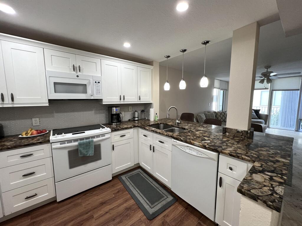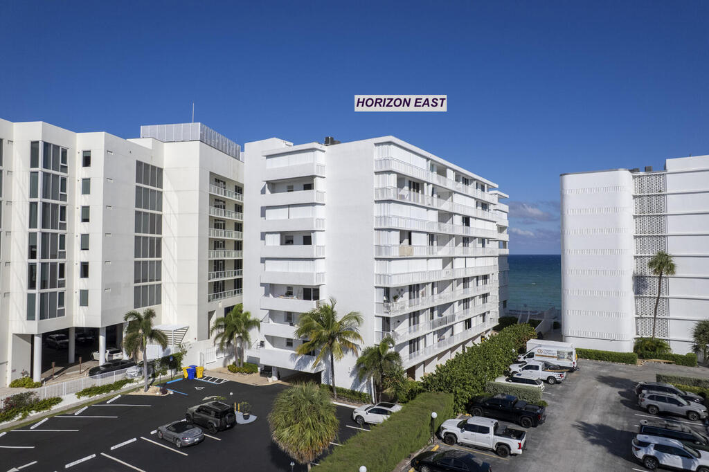 DIRECTLY ON THE BEACH! Bright, clean & spacious 2/2 + DEN fully furnished/turnkey in Horizon East*Enjoy the ocean view from the living room & ocean breeze from the balcony*Completely upgraded couple years ago with travertine marble flooring, open kitchen with white cabinets & granite counter tops*Newer bathrooms, custom built-ins, cedar walk-in closet in master bedroom*Den/office is closed off with glass doors and can be used as a 3rd bedroom*Washer & dryer inside* Covered garage parking for one car*Walking distance to restaurants and shopping, minutes to International Palm Beach airport*A gem in paradise!